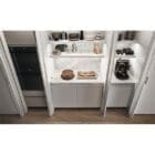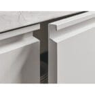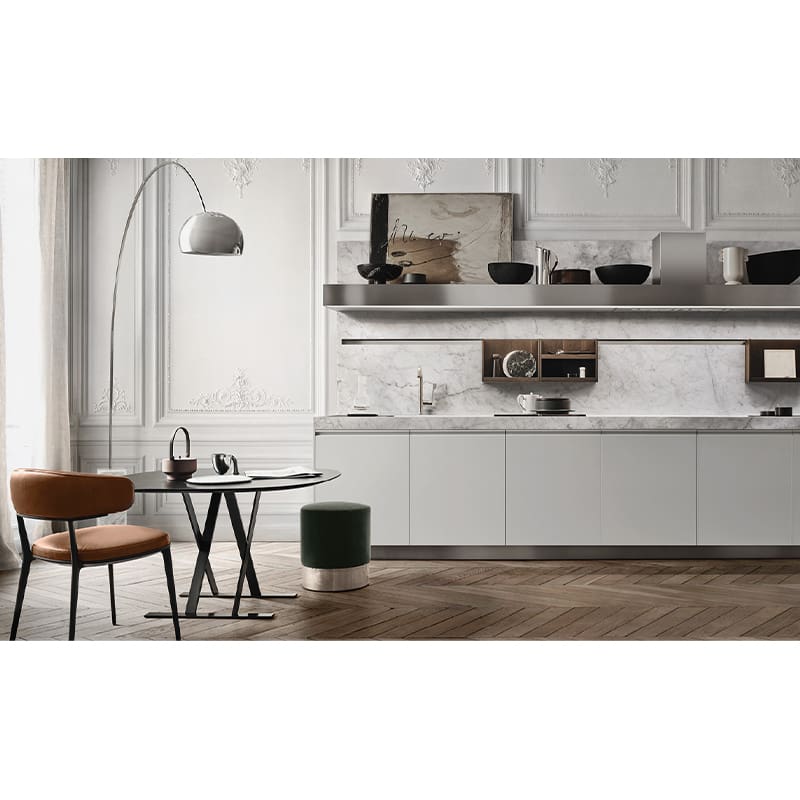 Pulizia ed eleganza si confrontano nella parete operativa lunga 304,4 cm, con fianchi di chiusura, basi h 72 cm, anta in Fenix NTM® bianco e maniglia Beta laccato bianco opaco in tonalità anta rif. Fenix NTM®, piano h 8 cm e schienale in marmo Carrara opaco con Profilo appendi oggetti in acciaio, integrato, attrezzato con elementi scorrevoli in legno e ceramica. Sopra la zona operativa, l’elemento funzionale Mensola Cappa h 14 cm, frontale in acciaio, con cappa integrata e illuminazione LED 3000K continua.