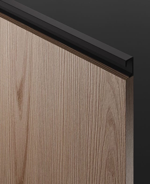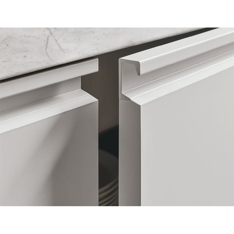 Essenziale nel disegno e funzionale nell’utilizzo, la maniglia Beta è un profilo in alluminio verniciato in finitura acciaio o nero, oppure nella stessa finitura dell’anta a cui si integra. In questa soluzione, la maniglia è in finitura laccato bianco opaco in tonalità anta rif. Fenix NTM®. Nello spazio operativo di preparazione e lavaggio, alla pulizia formale e alla funzionalità di utilizzo del bianco assoluto di piano e anta con maniglia Beta, corrisponde il caldo materico dei cassetti interni in legno scuro delle nuove attrezzature Moka Box, in frassino tinto, caratterizzate da divisori in alluminio anodizzato nero e in legno.