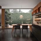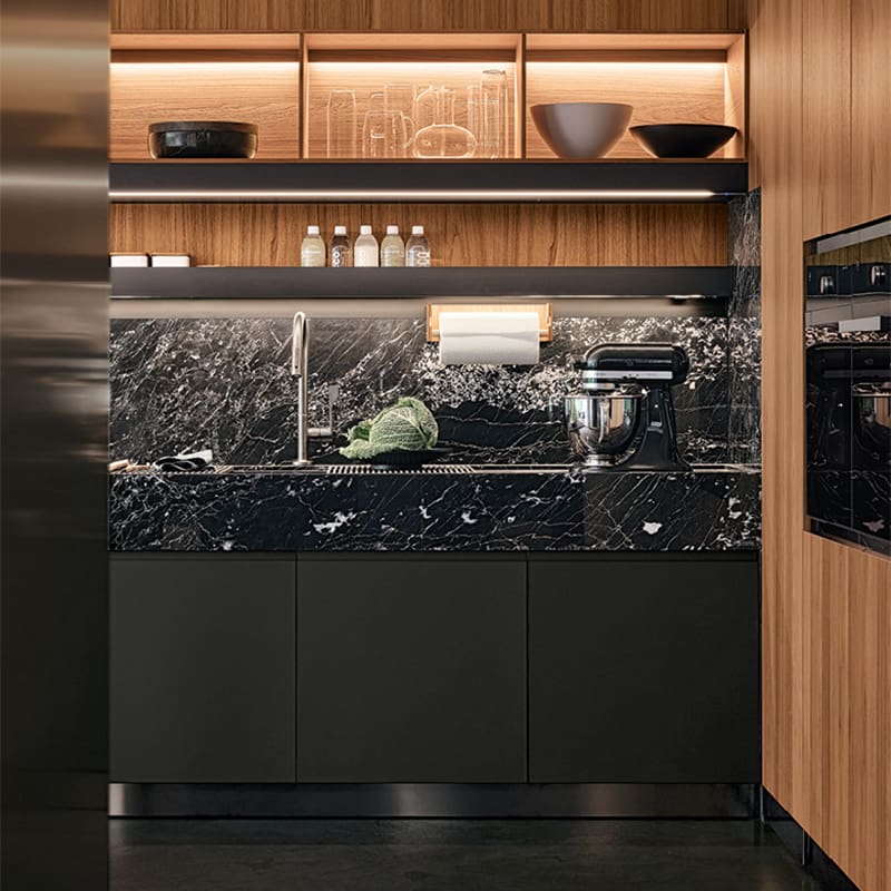 Ricercatezza dei materiali, cura del dettaglio, abbinamenti cromatici raffinati e coerenza formale. Sono le caratteristiche di un ambiente cucina di impostazione tradizionale, risolto con elementi progettuali unici ed esclusivi; impreziosito dal legno teak, che avvolge i muri con la boiserie, evidenzia le pareti attrezzate, i pensili a giorno, diventa protagonista del grande tavolo conviviale. Al centro, la zona operativa, con piano con invaso in marmo ad alto spessore, eleganti ante Convivium e schienale attrezzato con Mensolinea e Mensoluce, le esclusive mensole Arclinea che concentrano diverse funzioni, dall’illuminazione puntuale all’aspirazione dei fumi, fino al contenimento ordinato di piccoli oggetti d’uso quotidiano. Sulla destra la parete attrezzata con forni, frigorifero e dispensa, con l’elemento angolare Wic, il comodo vano dispensa integrato.