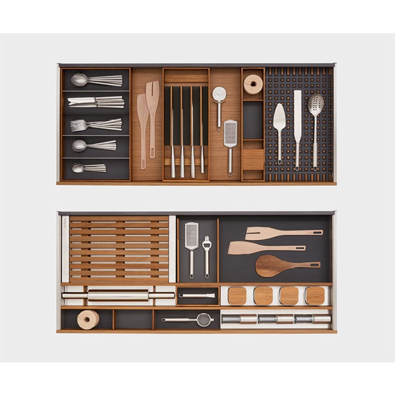 Arclinea – Cucina Convivium Tavolo Penisola; Convivium è luogo aperto, una cucina come spazio libero e organizzato, un ambiente dove rinnovare ogni giorno il rito dello stare insieme, il luogo in cui tutta una serie di azioni concrete – contenere, preparare, cucinare si trasformano in riti ed emozioni. In cucina si respirano aromi che parlano di storie familiari o di luoghi lontani, si perpetuano antiche ricette o se ne sperimentano di nuove e soprattutto si mangia tutti insieme, seduti attorno al grande tavolo. Convivium arreda le pareti di una stanza che diventa calda, accogliente, funzionale, con isola-tavolo al centro e mensoloni che corrono, superiormente, su tutto il perimetro.