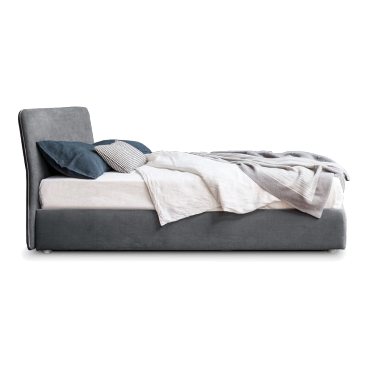stile è ampiamente personalizzabile nei dettagli e nelle finiture. Il rivestimento, disponibile in tessuto, pelle o ecopelle, è completamente sfoderabile. Un bordo ornamentale impreziosisce ed evidenzia il perimetro del letto e può essere scelto in tinta o a contrasto rispetto al rivestimento. In alternativa, la testata in tessuto può essere decorata con una