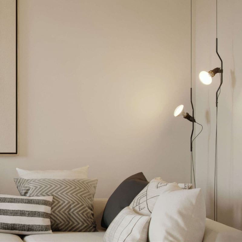 Flos – Lampada a sospensione Parentesi nera; Lampada a luce diretta. Il movimento verticale del corpo illuminante è ottenuto mediante lo scorrimento di un tubolare di acciaio sagomato, verniciato a liquido o nichelato, su un cavetto di acciaio teso tra il plafone e pavimento (lunghezza utile mm 4000). Testa dell’apparecchio in elastomero stampato ad iniezione di colore nero all’interno della quale è alloggiato l’interruttore dell’apparecchio. Cavo elettrico lunghezza utile, dal portalampada, mm 4000.