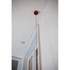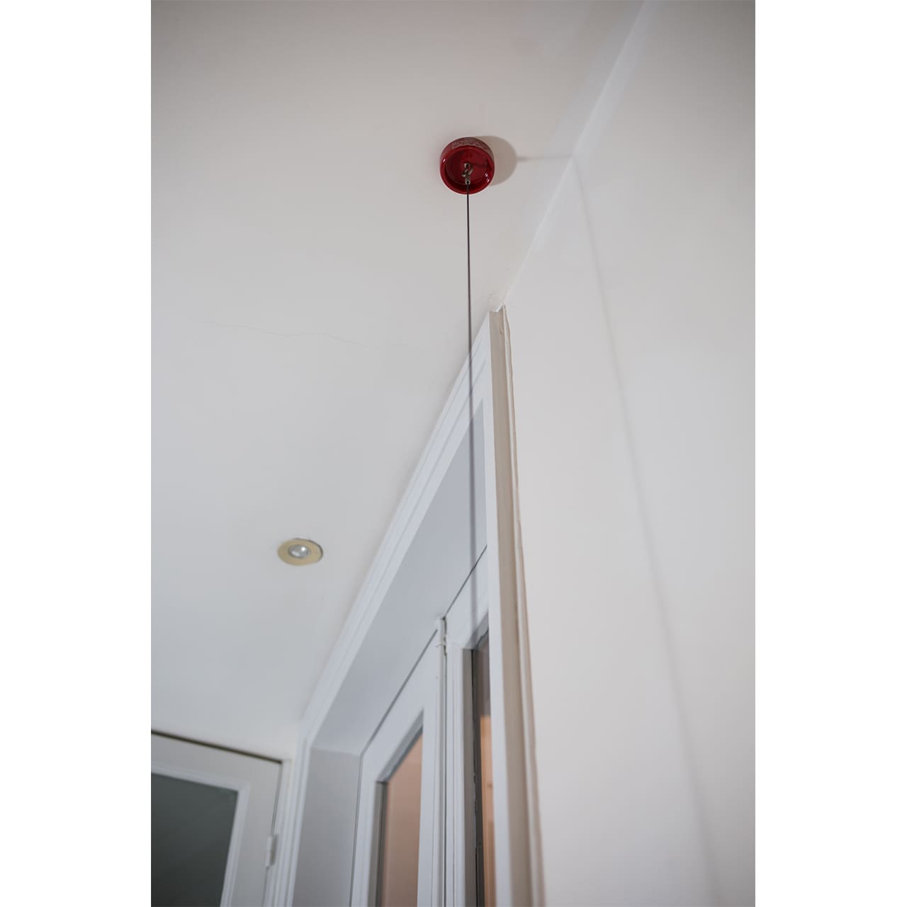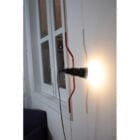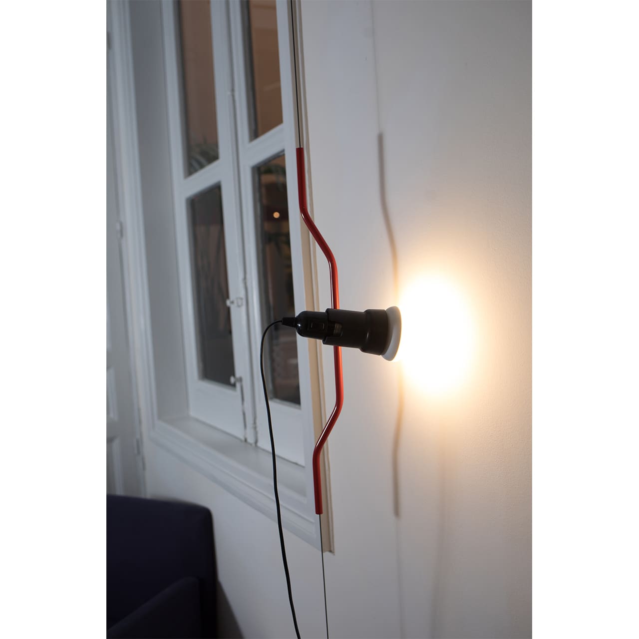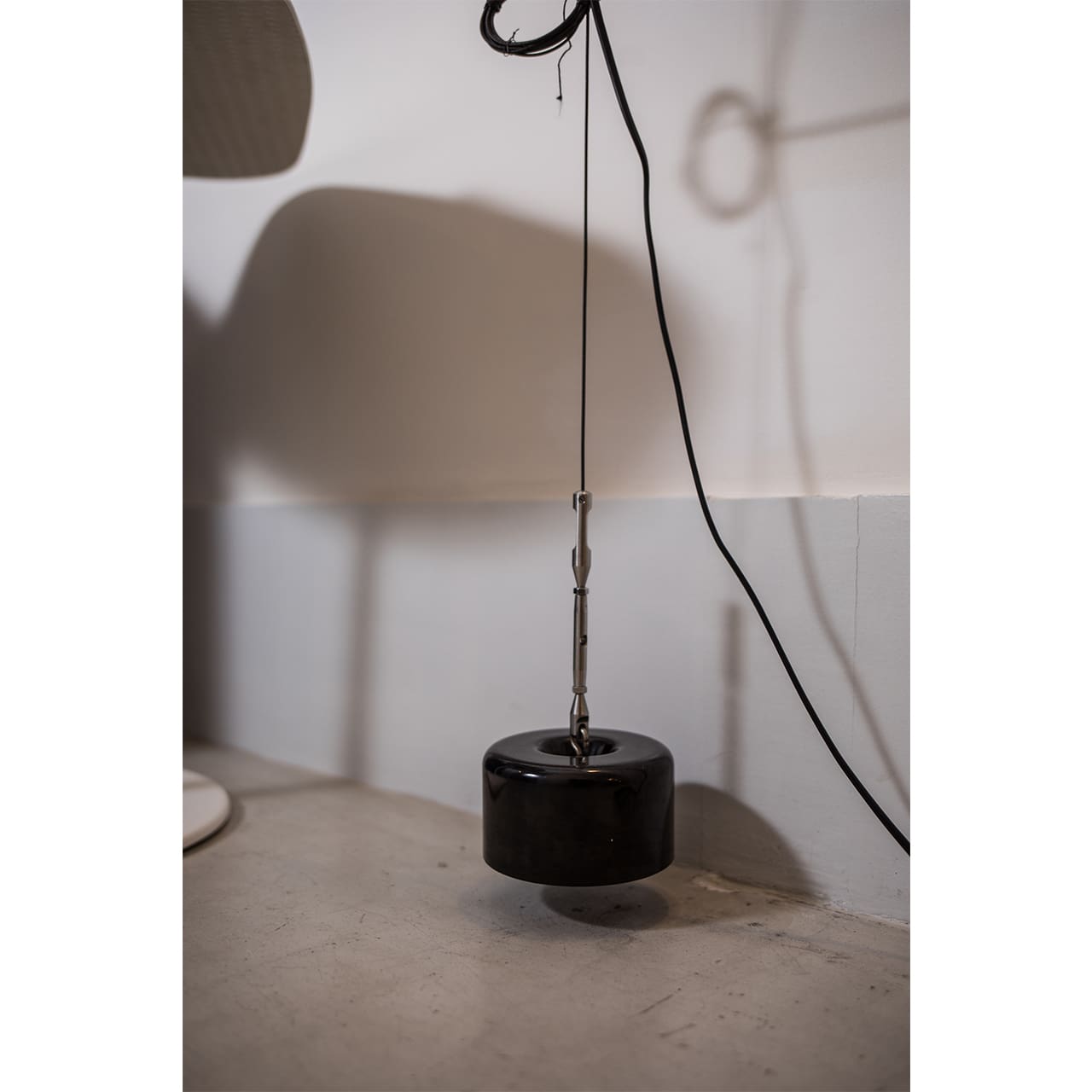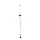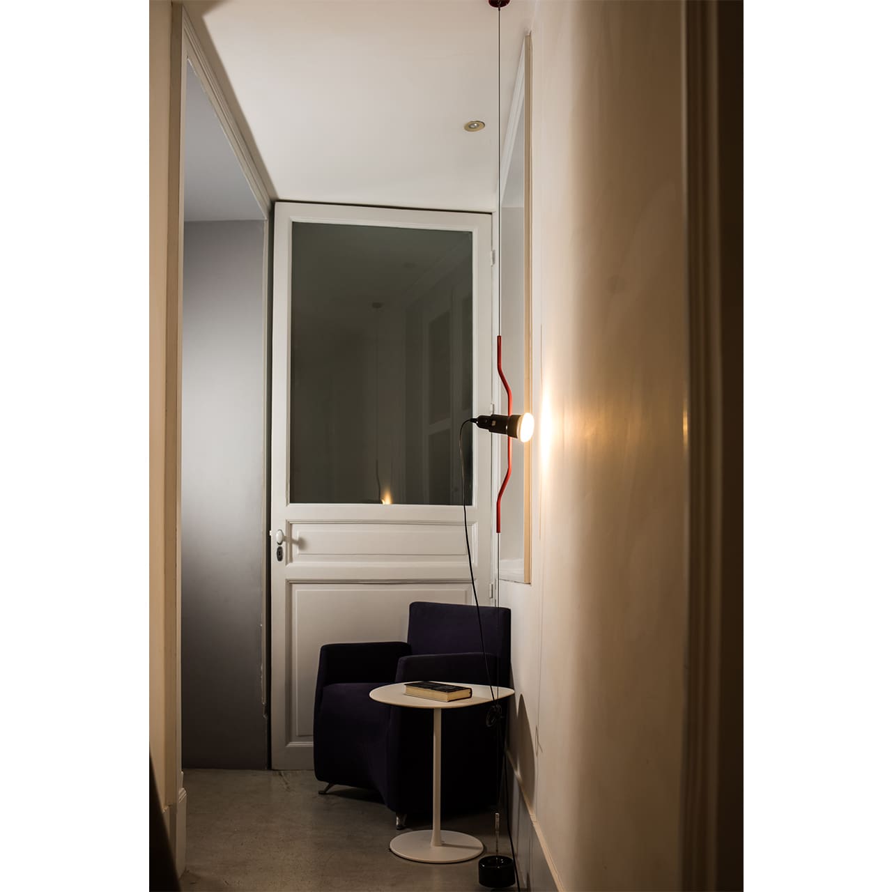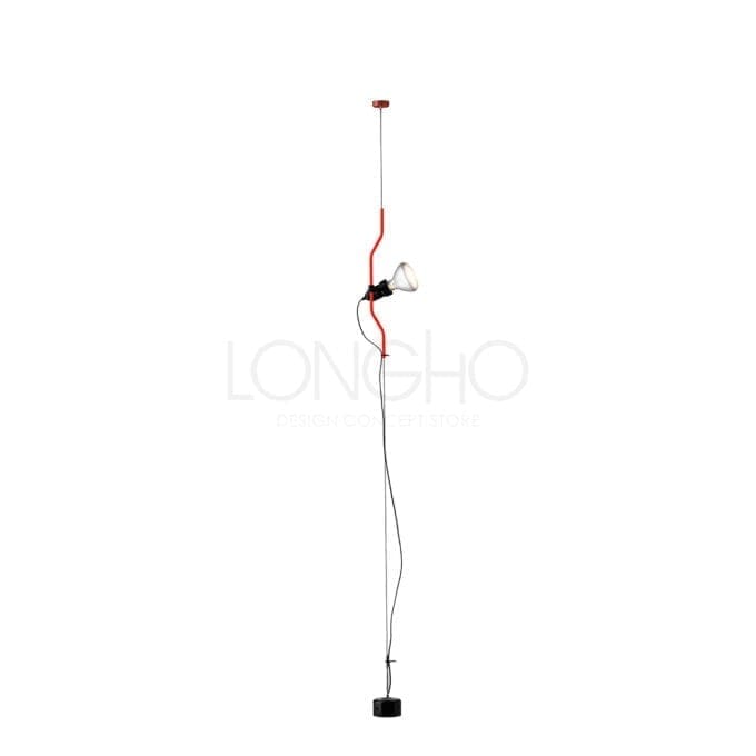 Flos – Lampada a sospensione Parentesi rossa; Lampada a luce diretta. Il movimento verticale del corpo illuminante è ottenuto mediante lo scorrimento di un tubolare di acciaio sagomato, verniciato a liquido o nichelato, su un cavetto di acciaio teso tra il plafone e pavimento (lunghezza utile mm 4000). Testa dell’apparecchio in elastomero stampato ad iniezione di colore nero all’interno della quale è alloggiato l’interruttore dell’apparecchio. Cavo elettrico lunghezza utile, dal portalampada, mm 4000.