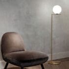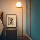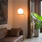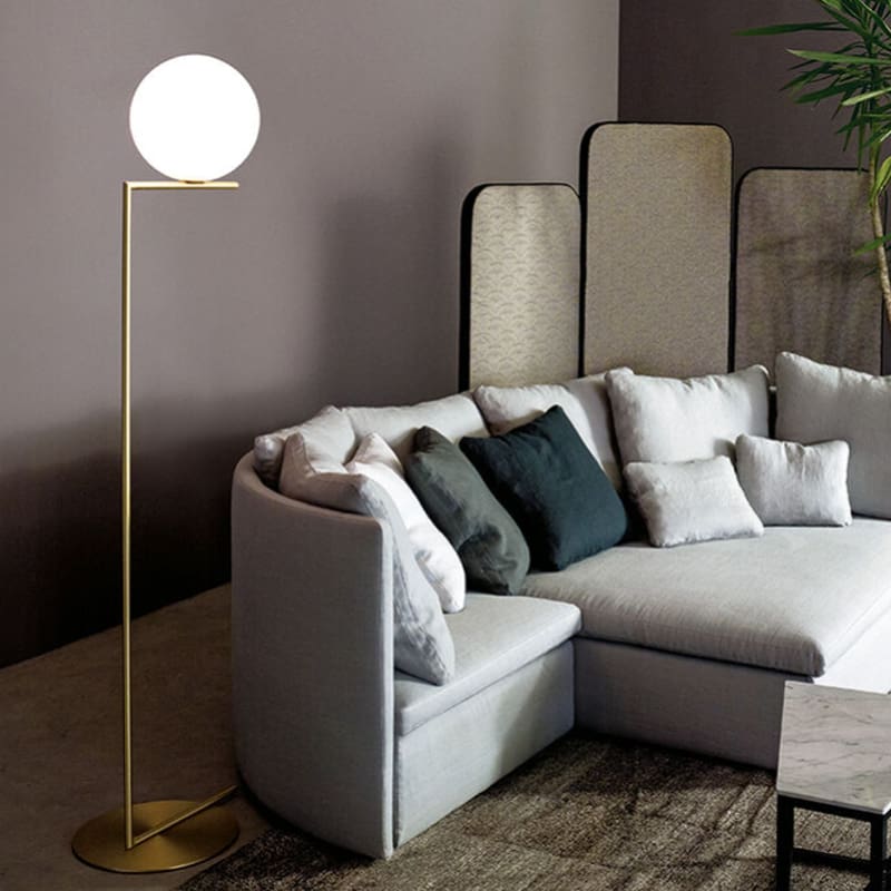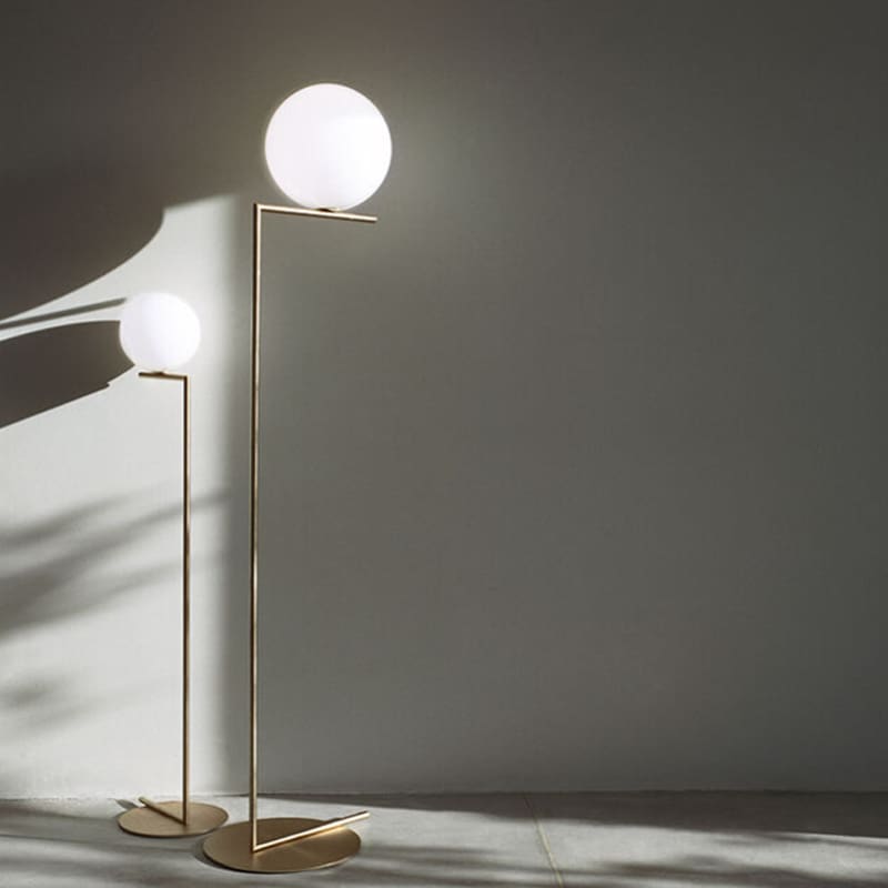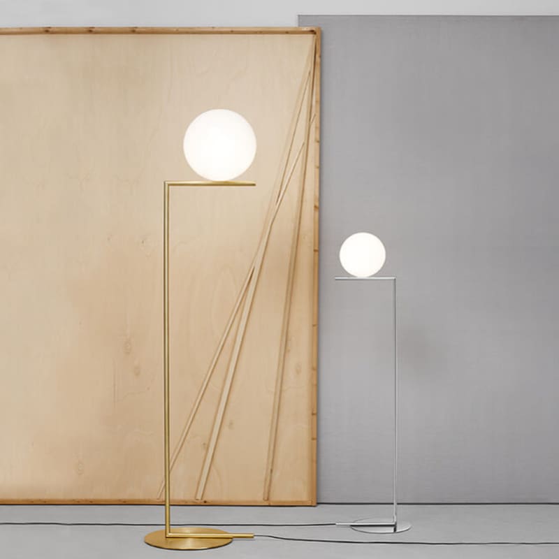 Flos – Lampada da terra IC F1 ottone; Apparecchio di illuminazione da terra a luce diffusa. Telaio in ottone, spazzolato e verniciato trasparente o acciaio cromato. Diffusore opalino di vetro soffiato. Dimmer presente sul cavo di alimentazione.