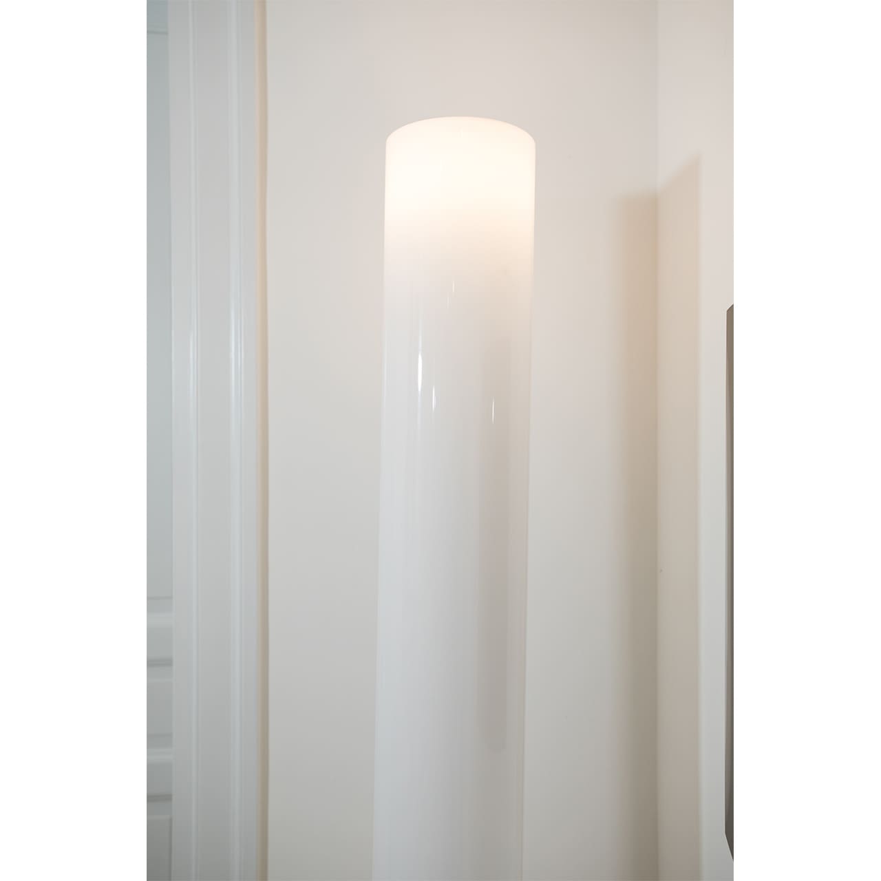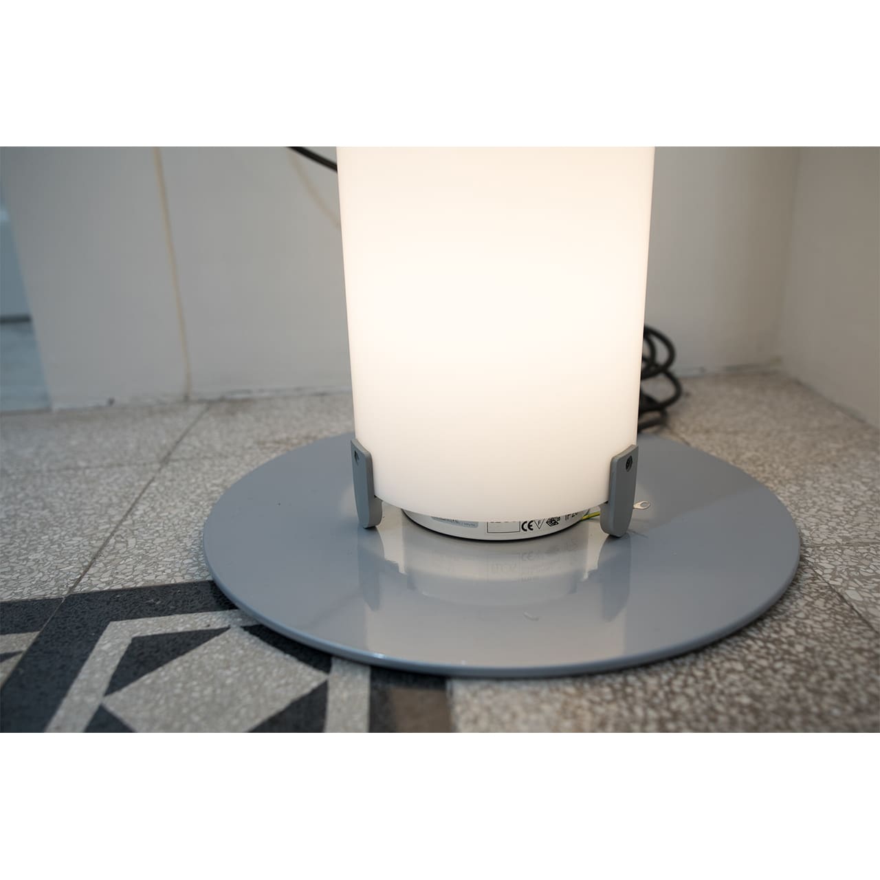 Flos – Lampada da terra Stylos argento; Lampada da terra a luce indiretta e diffusa. Base di acciaio verniciato di colore argento a polvere. Diffusore cilindrico, estruso in polimetilmetacrilato (PMMA) opalino. Le funzioni ON/OFF delle due sorgenti luminose poste alle due estremità del diffusore dell’apparecchio, avvengono mediante doppio interruttore a pedale montato sul cavo elettrico di alimentazione.