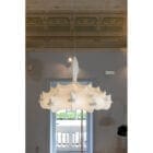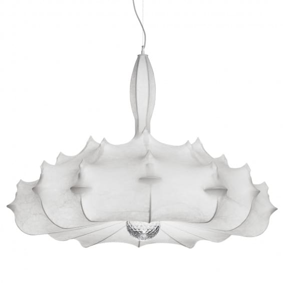 Flos – Lampadario Zeppelin 1; Apparecchio di illuminazione a sospensione a luce diffusa. Struttura interna in acciaio verniciato a polvere bianco. Diffusore in resina “cocoon” spruzzata sulla struttura, con protezione trasparente, realizzata a spruzzo alla fine della lavorazione. “Candele” in polimetilmetacrilato (PMMA) trasparente. Sfera in cristallo sfaccettato, per un effetto scintillante, posizionata al centro nella parte inferiore dell’apparecchio.