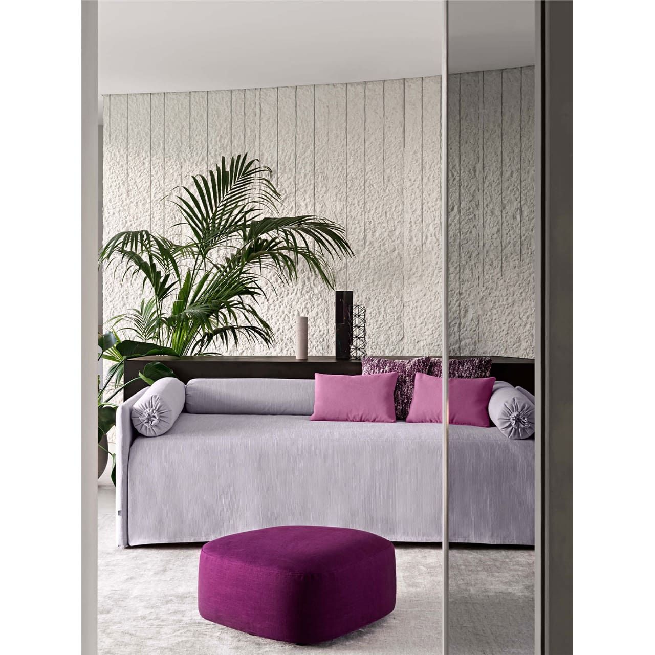 I due letti affiancati si ancorano stabilmente grazie a due blocchi in acciaio e gomma. Completato da un elegante basco di copertura, da buste porta guanciale e cuscini a rullo, può essere ulteriormente personalizzato con l’aggiunta dello schienale.