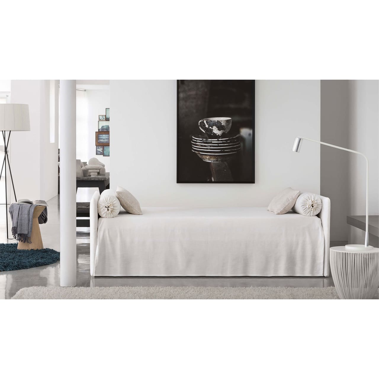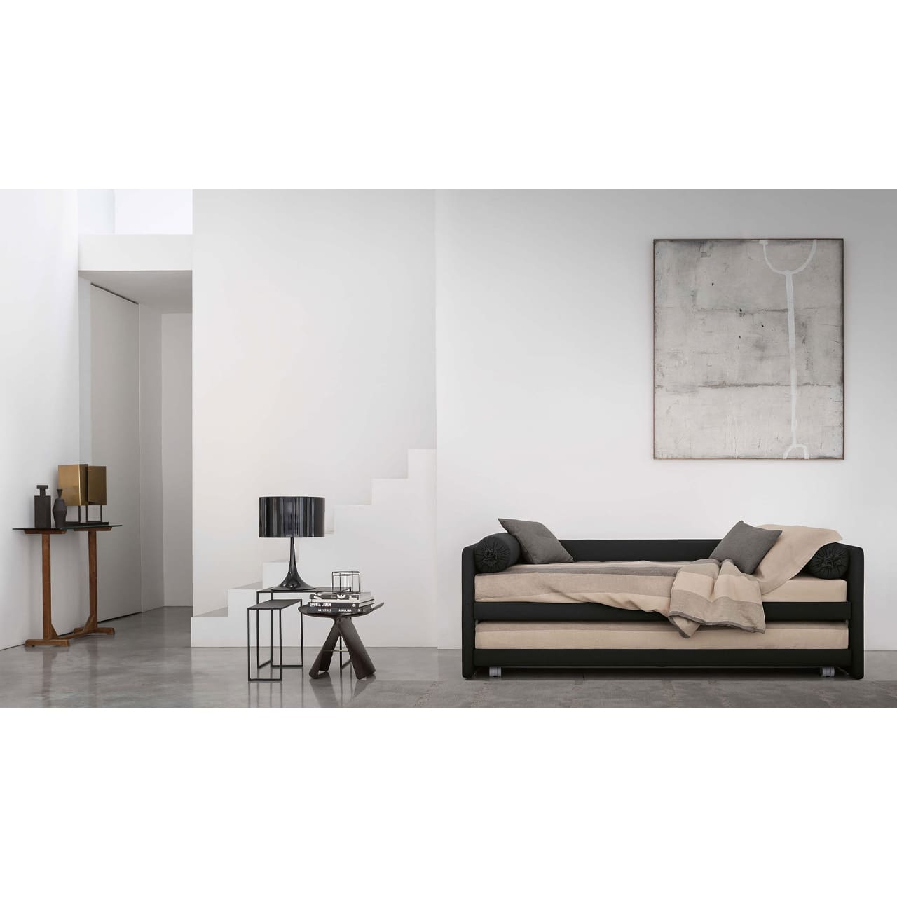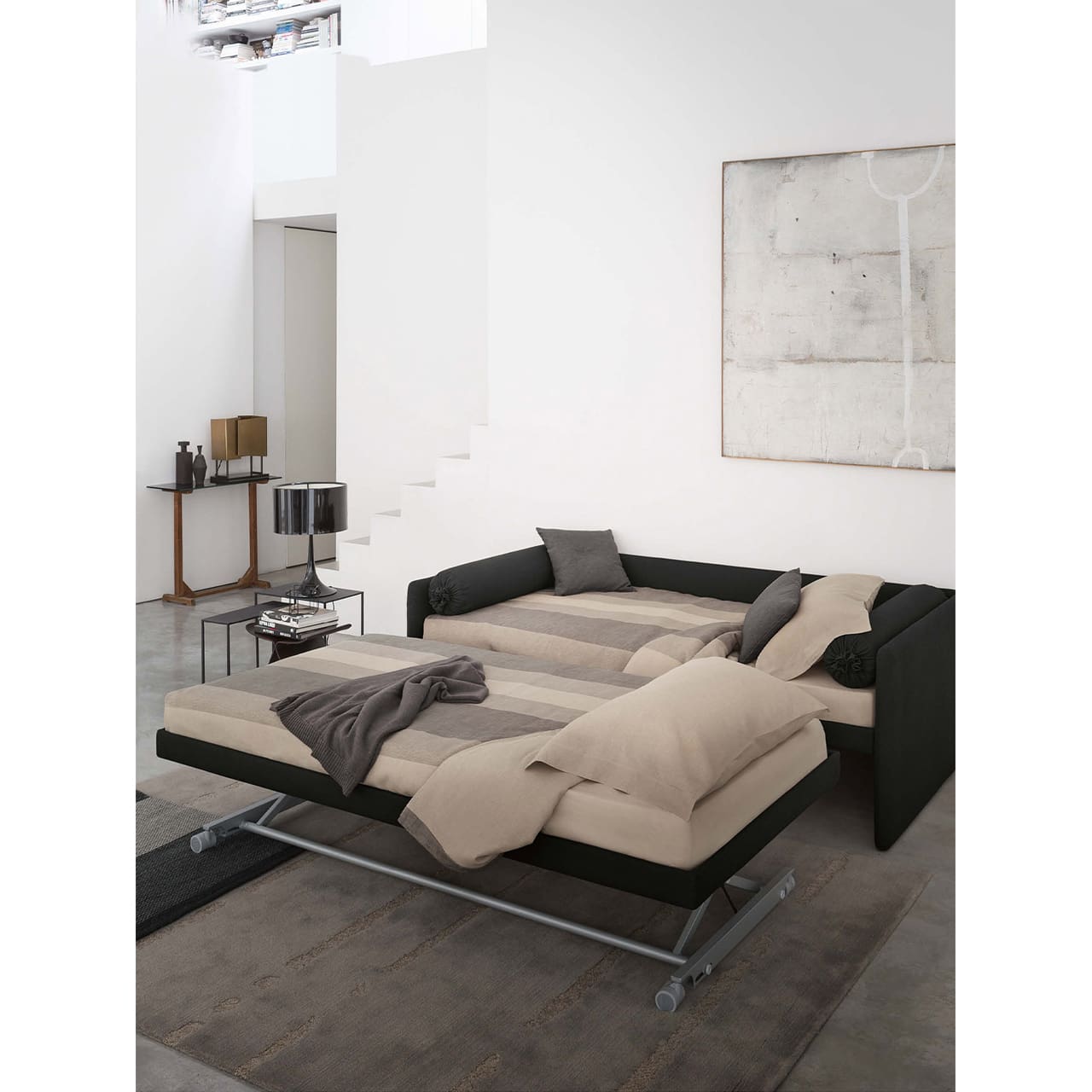 Flou – Letto singolo Duetto; Letto trasformabile dal design semplice ed elegante. Struttura rivestita in tessuto, pelle o Ecopelle completamente sfoderabili e piano di riposo a doghe fisse. Il letto singolo diventa facilmente matrimoniale con l’aggiunta del secondo letto estraibile e sollevabile grazie ai pratici pistoni a gas.