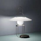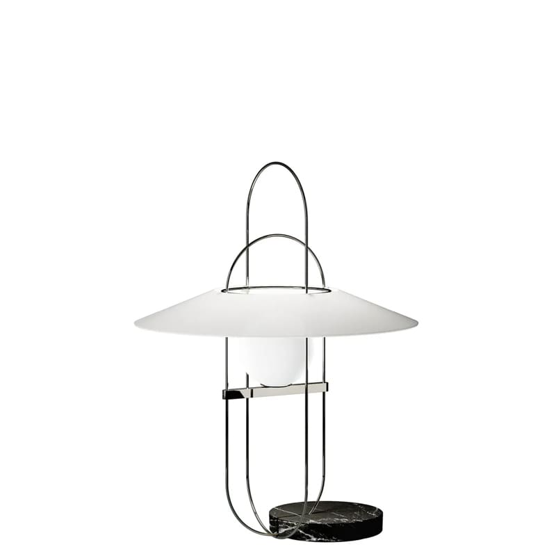 Fontana Arte – Lampada da tavolo Setareh glass media nero bianco; È questo il nome della famiglia di apparecchi di illuminazione che Francesco Librizzi, giovane architetto siciliano con base a Milano, firma per la prima volta per FontanaArte. Setareh nasce dal tema di dare corpo alla luce. La lampada è composta da una sfera magicamente sospesa all’interno di una struttura metallica sottile. Un gioco di masse e di traiettorie circolari genera un disegno bilanciato di dinamiche gravitazionali. La luce emanata dalla sfera si diffonde sullo spazio circostante e irraggia il telaio.