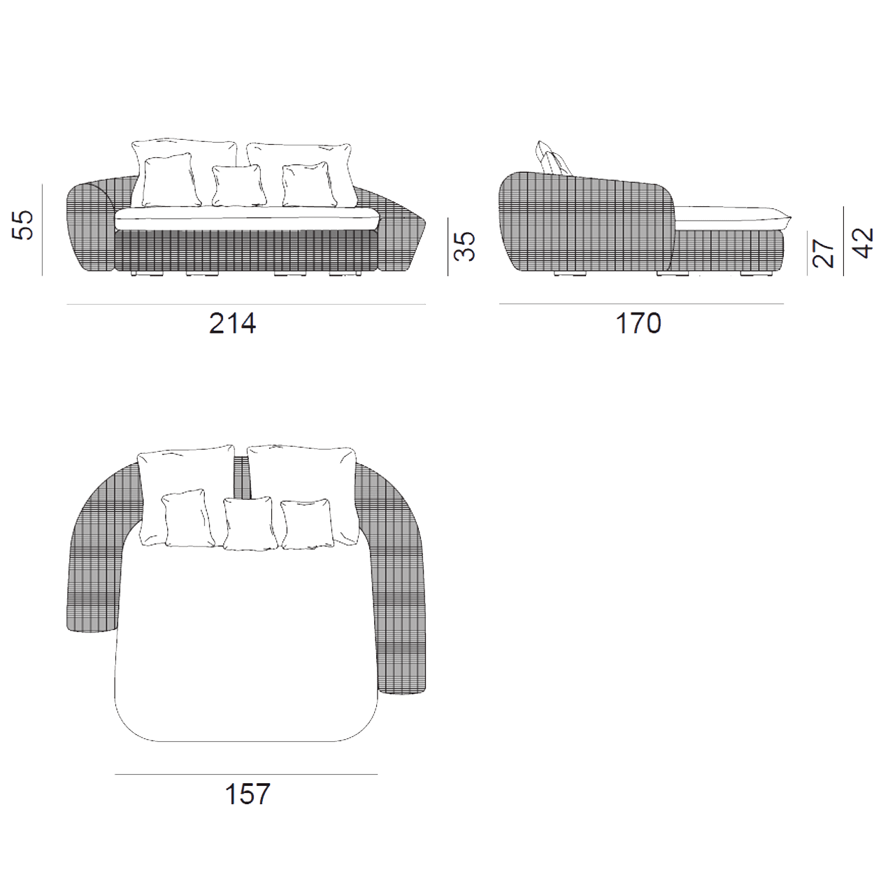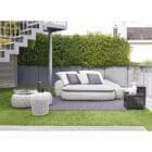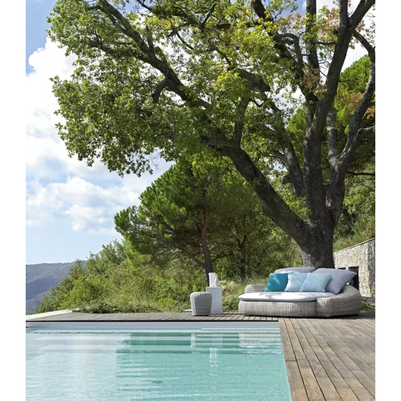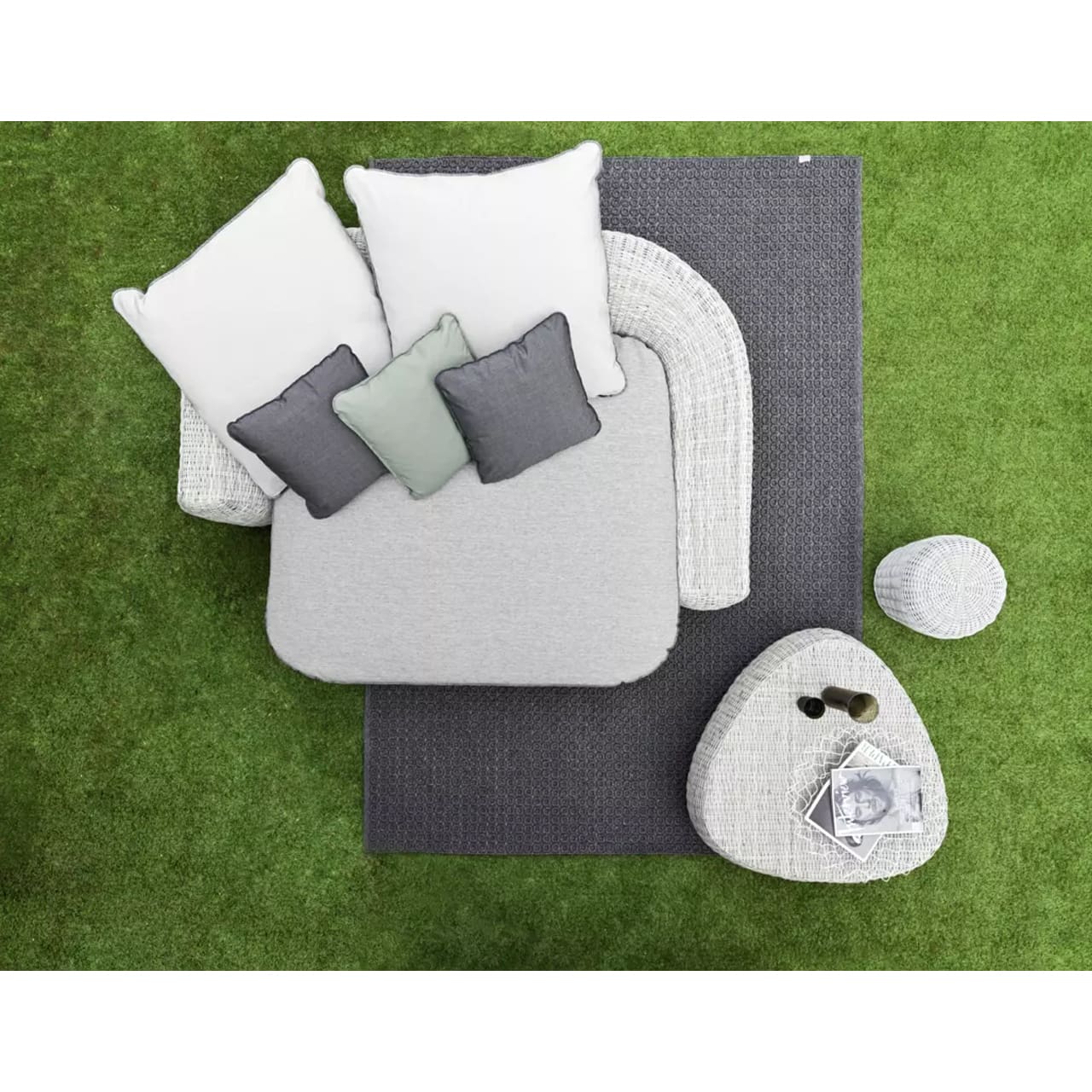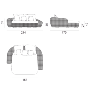 Fibre sintetiche di ultima generazione pensate per resistere all’acqua e alla luce e per mantenere nel tempo le qualità tecniche e cromatiche, e che mantengono un aspetto molto naturale e durevole. Le sedute e gli schienali sono arricchiti da cuscini oversize sfoderabili per un comfort accentuato.