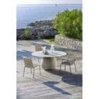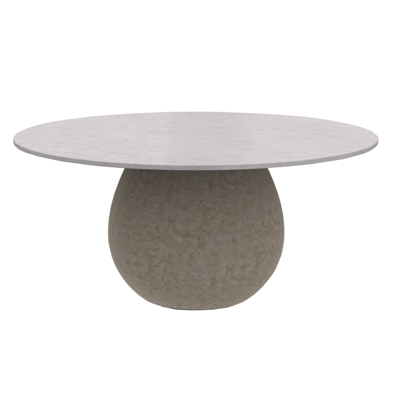 Tavolo con base scultorea di forma tondeggiante realizzata in cemento finitura crackle che sostiene un sottile piano rotondo in marmo bianco Carrara.