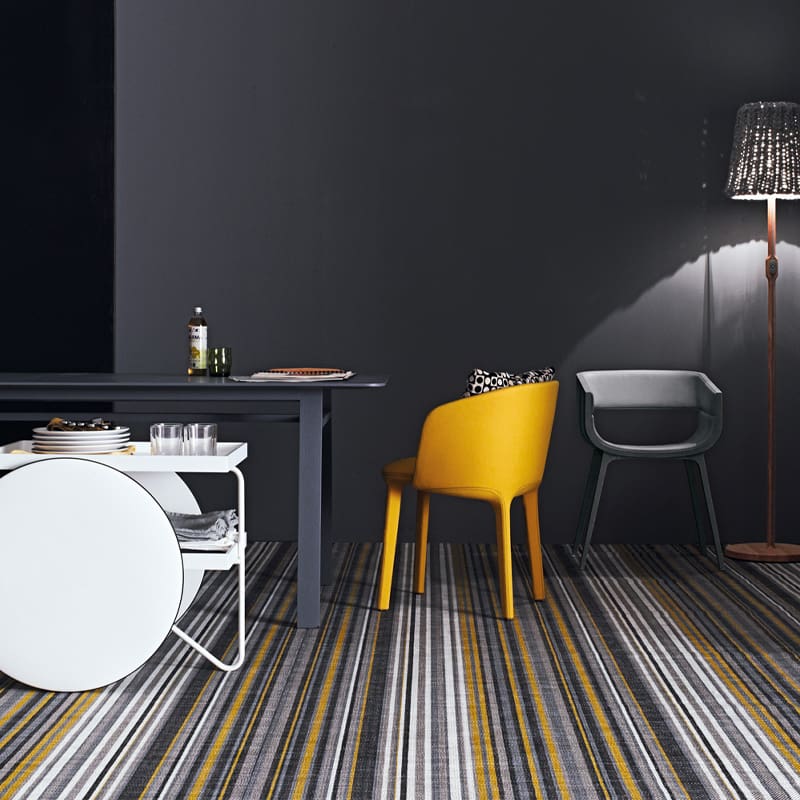 Horm – Poltroncina Lepel Liscia in tessuto senape; Lepel è un sistema di sedute imbottite, interamente rivestite in tessuto o in pelle. La lavorazione artigianale e la possibilità di personalizzare le finiture -dai tessuti impiegati, alle cuciture a vista- rende questa seduta unica nel suo genere. Lepel, in Afrikkans vuol dire cucchiaio: è proprio questa la funzione dei due schienali, contenere e sostenere la seduta come un cucchiaio.