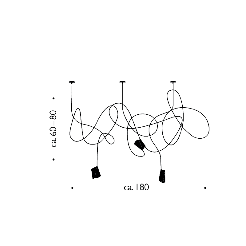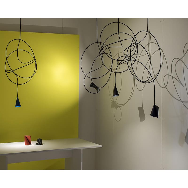 Ingo Maurer – Lampada a sospensione Signature set 3; Signature di Ingo Maurer è la nuova lampada da sospensione che si staglia nello spazio come un disegno tridimensionale: un tratto leggero come una firma, da cui il nome. Progetto dal carattere istintivo, ispirato dal movimento casuale di una corda che cade, Signature si compone di un cavo nero morbido da muovere in aria e piegare in curve morbide e cerchi da fissare con piccole clip alla struttura circolare elastica, sempre di colore nero, dando vita a geometrie ogni volta uniche.
