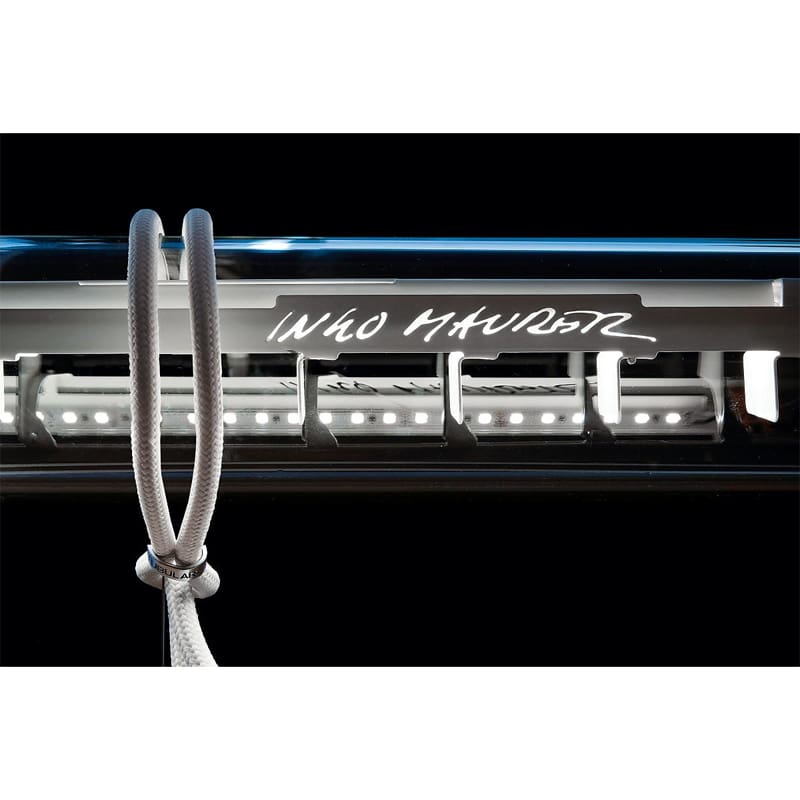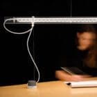 Con la sua lunghezza di 125 cm, la versione da tavolo dell’apparecchio in vetro tubolare filigranato illumina un’area particolarmente ampia – ideale per il lavoro alla scrivania o come illuminazione da ufficio. Inoltre il tubo di vetro è attaccato al soffitto da un cavo sottile e nella nuova versione è combinato per la prima volta con una base dell’apparecchio. La base funge da contrappeso tramite una corda di trazione, mantenendo sospeso il tubo di vetro trasparente. Per il design, Sebastian Hepting ha scelto un tubo di vetro borosilicato non lavorato in cui numerosi punti luce LED sono infilati insieme come un filo di perle.