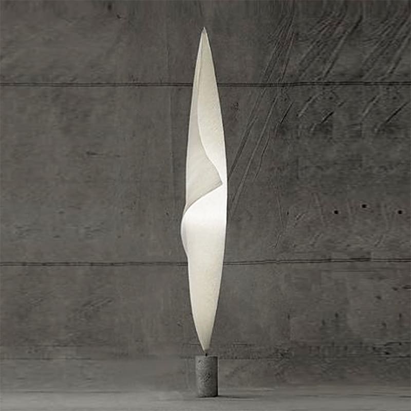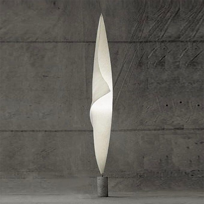 Ingo Maurer – Lampada da Terra Wom Tum Bu 1; Come tutti i MaMoNouchies, Wo-Tum-Bu 1 è prodotto a mano in elaborati processi di lavoro. La materia prima per l’ombrello di carta è prodotta in Giappone. I piedini in calcestruzzo vengono gettati a mano. Tracce irregolari di bolle e il conseguente aspetto diverso fanno parte del concetto di design. Ogni Wo-Tum-Bu è unico. Carta, calcestruzzo, metallo, acciaio inossidabile, schermo in fibra di vetro.