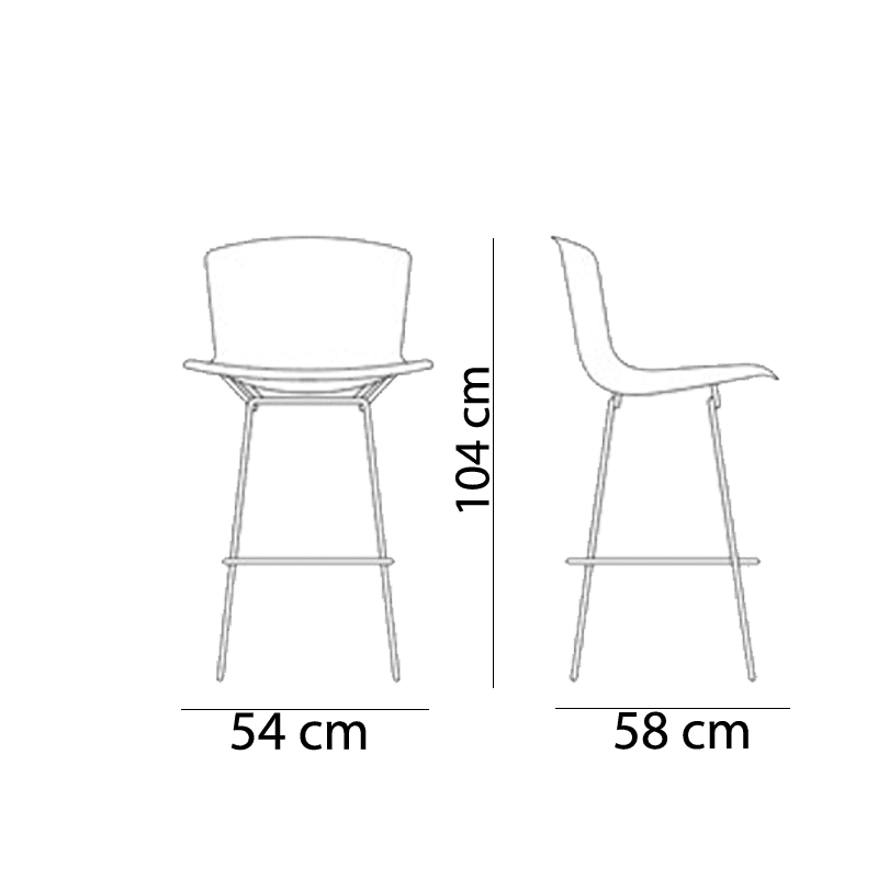 Knoll – Sgabello Bar Bertoia Cuoio H 104; La famiglia Bertoia comprende ora uno squisito sgabello da bar rivestito in cuoio. Il bellissimo rivestimento in cuoio è applicato su un sedile a conchiglia sagomata, evidenziando il carattere scultoreo del classico design Bertoia.