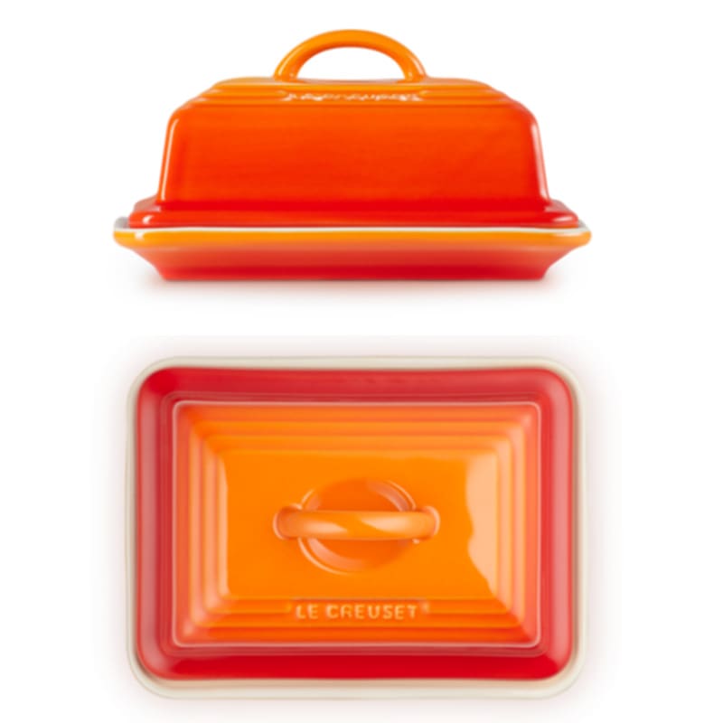 Le Creuset – Portaburro 17×12 Arancio; Sono le piccole cose a fare la differenza, come questo portaburro: realizzato in gres vetrificato può essere utilizzato sia nel frigorifero che nel forno a microonde, per conservare il burro freddo o per intiepidirlo e spalmarlo meglio. È molto utile anche d’estate perché il gres vetrificato conserva il suo contenuto fresco più a lungo.