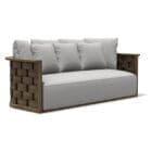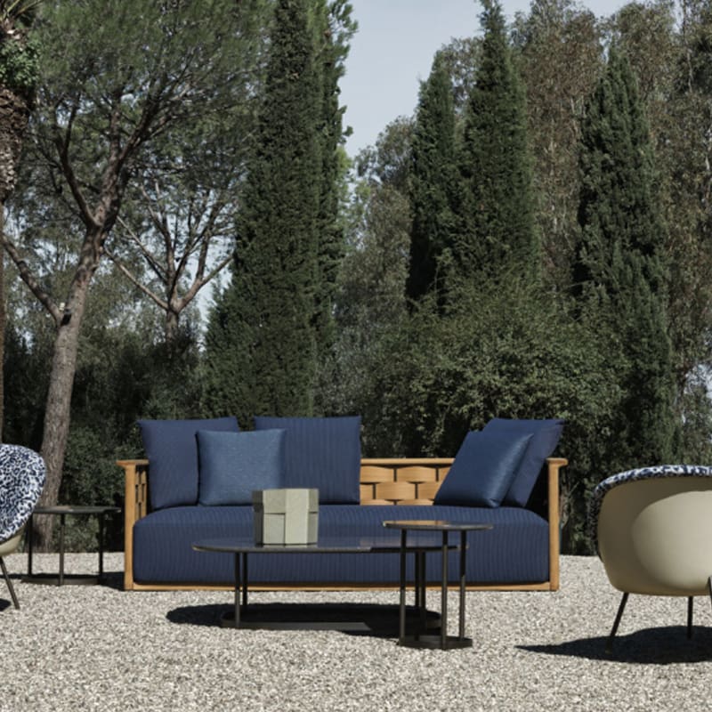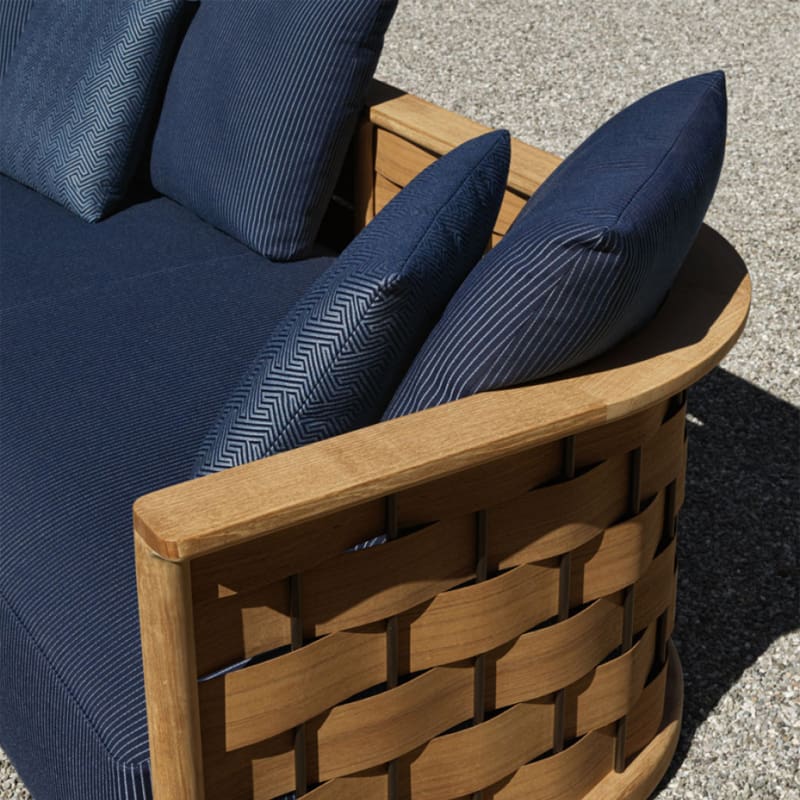 Molteni – Divano outdoor Palinfrasca teak L208; I temi che identificano la Collezione Landmark le linee curve e avvolgenti della struttura in massello di teak e il motivo intrecciato trama ordito in macro scala permangono nella poltrona e, grazie alle proporzioni più compatte, diventano ancora più chiari ed espressivi.