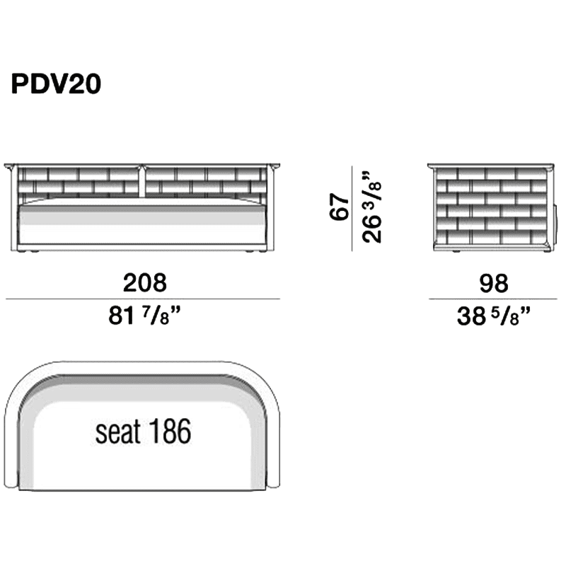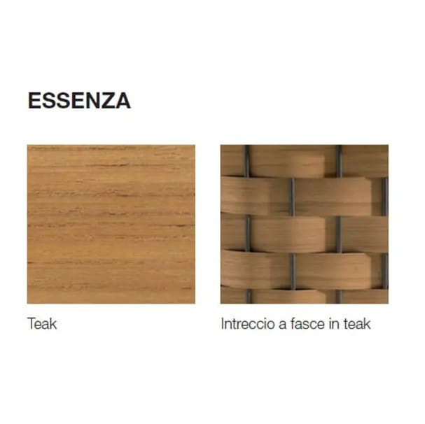 Lo schienale curvilineo è come un abbraccio che avvolge l’utente, esaltando l’idea di un comfort protettivo e accogliente. Così come negli elementi componibili del divano, lo schienale può avere l’intreccio in teak o in poliuretano EVA nella tonalità verde oliva. Come nei divani, la cuscinatura di seduta garantisce un confort avvolgente.