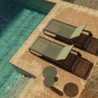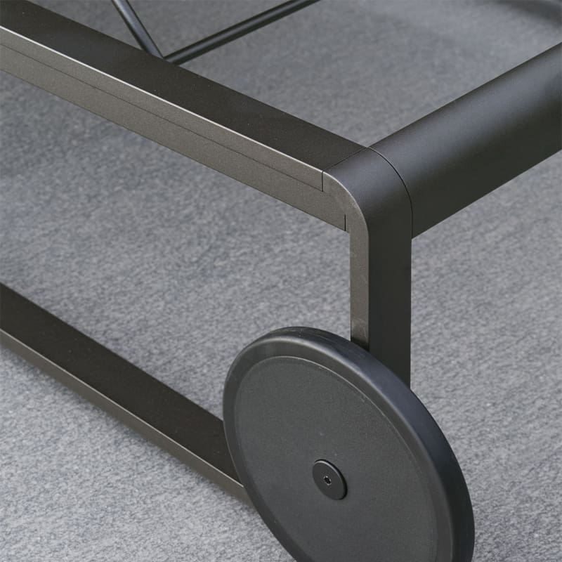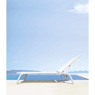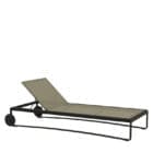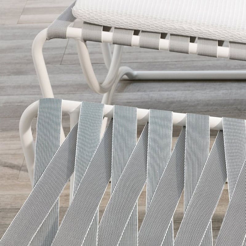 Molteni – Lettino Guell versione batyline; Il lettino prendisole, archetipo per eccellenza degli arredi da esterno, interpreta tutti gli elementi che caratterizzano l’estetica della Collezione Timeout, riproponendo il tema della fascia in alluminio verniciato color brunito, a correre lungo tutto il profilo, e il motivo tradizionale dell’intreccio in corda in polipropilene. Lo schienale consente differenti inclinazioni.