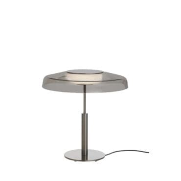 Dora è disponibile in versione da tavolo e in versione da terra, entrambe composte da un paralume a cappello in vetro sorretto da uno stelo metallico e completato da un disco superiore anch’esso in metallo. Due sono le finiture a catalogo: corpo oro satinato con paralume rosso, dall’estetica fortemente retrò, e corpo nickel satinato con paralume fumé, più contemporanea e austera.