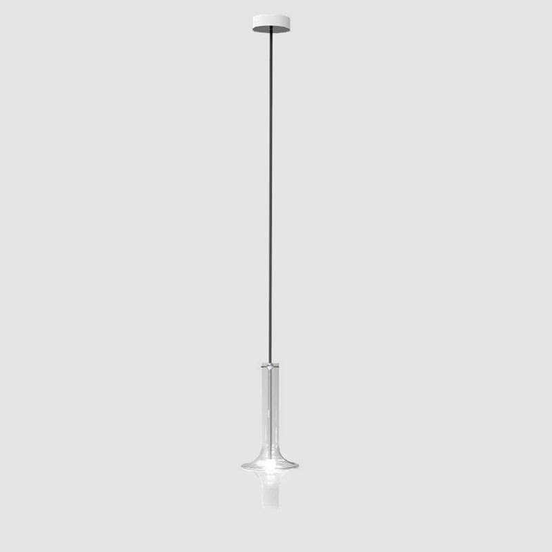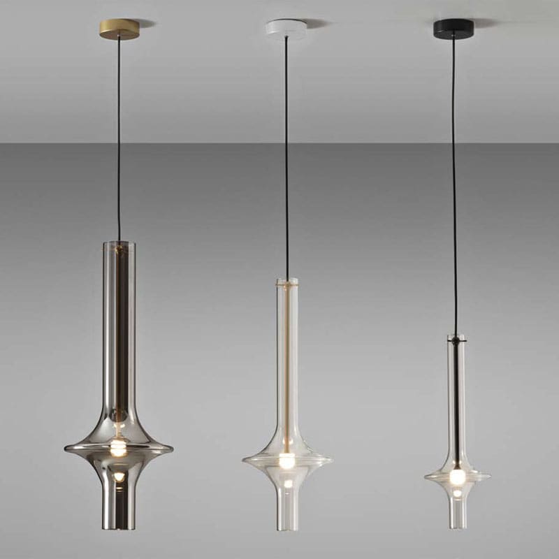 Penta light – Lampada a sospensione Wonder Mini 3000K; La meraviglia della combinazione di più lampade Wonder di dimensioni, finiture e altezze diverse ha la stessa luminosa bellezza del vetro borosilicato con cui sono realizzate le singole canne, in finitura trasparente o fumé.