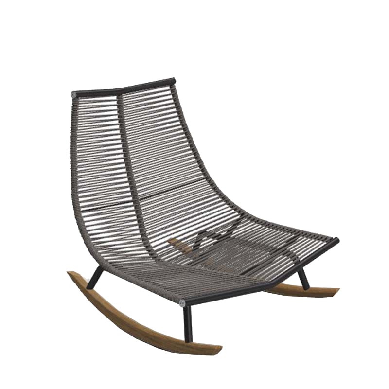 La rigorosa struttura in acciaio inossidabile, avvolta dai filamenti di corde in poliestere o in acrilico, incontra i pattini in teak, creando un mix di materiali dall’equilibrio perfetto. Le molteplici varianti cromatiche offerte da questa collezione lasciano spazio alla massima personalizzazione del proprio arredamento outdoor.