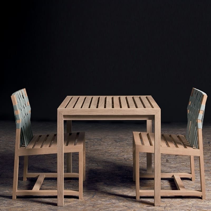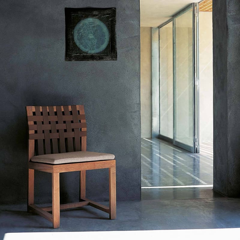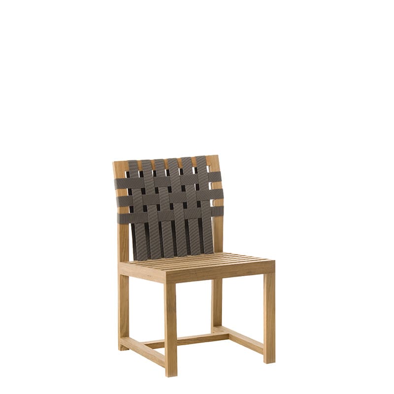 Roda – Sedia Network 149; La struttura delle sedie NETWORK è realizzata in teak massello ed ha un design pulito e semplice, quasi rigoroso con le sue linee orizzontali perfette. Il comfort dello schienale è assicurato da cinghie in poliestere disponibili in molti colori, mentre la seduta in teak può ospitare confortevoli cuscini, realizzati con tessuti per esterni resistenti agli agenti atmosferici.