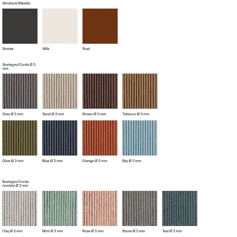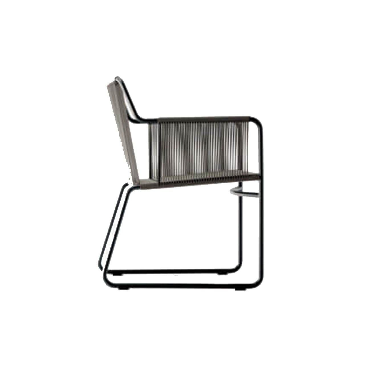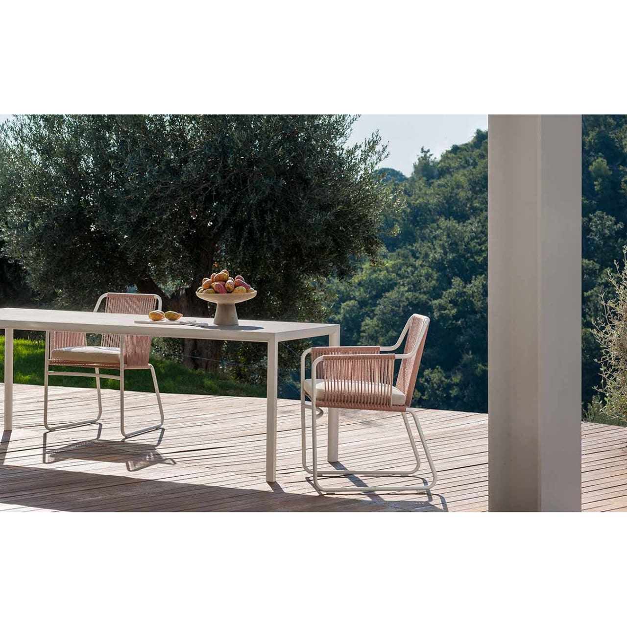 Roda – Sedia con braccioli Harp 359; La sedia con braccioli Harp è l’esaltazione di una lavorazione artigianale che porta il design outdoor: la struttura, in acciaio inossidabile verniciato per esterno, è lavorata e saldata a mano. La cordatura, ora proposta con un diametro di 3mm, anch’essa eseguita a mano, è realizzata in doppio filo ritorto di poliestere o acrilico con finitura cotoniera e diverse varianti cromatiche e gli abbinamenti tra le finiture di struttura e i colori delle corde soddisfano qualsiasi esigenza e si integrano in modo armonico ed elegante con tutti i tipi di arredo per esterni e in ogni contesto.