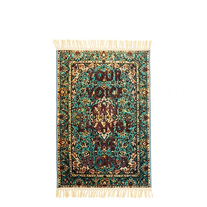 Seletti – Tappeto verticale Burnt Voice; Il fuoco, elemento fondamentale per i riti di tutte le popolazioni e le religioni che hanno attraversato il mondo, diventa lo strumento per dare vita ad una serie di frasi che provengono da importanti leaders occidentali.