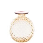 Venini – Vaso Balloton Large pesca filo rosso; “Cambia la tradizione nel 1970 e cambia nuovamente se stesso nel 2016. La sostanza resta: sembra morbido, eppure è vetro. L’illusione ottica del Monofiori di VENINI è nel suo nome: Balloton, la lavorazione unica che ricrea sulla superficie l’effetto matelassé. Inoltre l’opera è lavorata a mano, soffiata nel caratteristico stampo in metallo e finita nel collo sottile con un filo colorato applicato a caldo, che varia nel colore.”