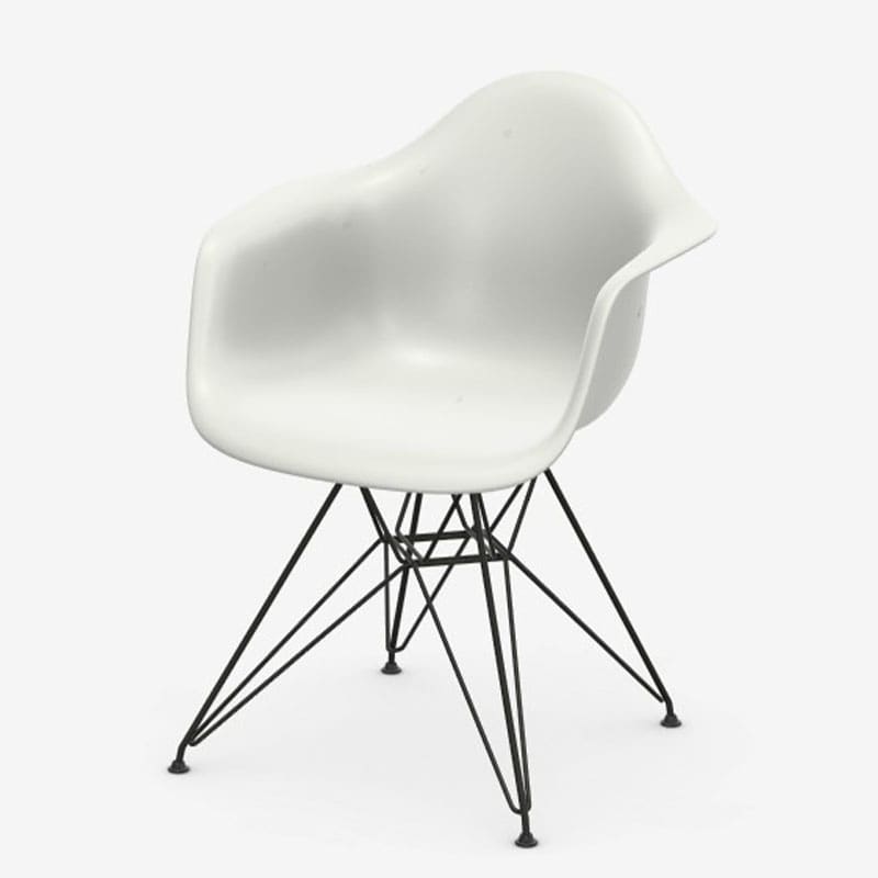 Vitra – Eames Plastic Armchair DAR cotton white RE; Fin dall’inizio degli anni ’50, quando Charles e Ray Eames progettarono le Plastic Chairs, questi elementi d’arredo sono diventati icone del modernismo americano della metà del secolo scorso. In particolare, la sedia DAR (Dining Height Armchair Rod Base) si distingue come inimitabile classico del design, combinando eleganti forme leggere e robustezza strutturale nella complessa costruzione in filo d’acciaio del suo basamento a ‘torre Eiffel’. Le Eames Plastic Chairs introdussero inoltre una nuova tipologia di mobile, divenuta da allora molto diffusa: la sedia multifunzionale, la cui scocca può essere abbinata a una varietà di diverse basi per le più svariate destinazioni d’uso. Già negli anni ’50 Charles e Ray Eames presentarono una serie di basi in grado di permettere varie posizioni di seduta.