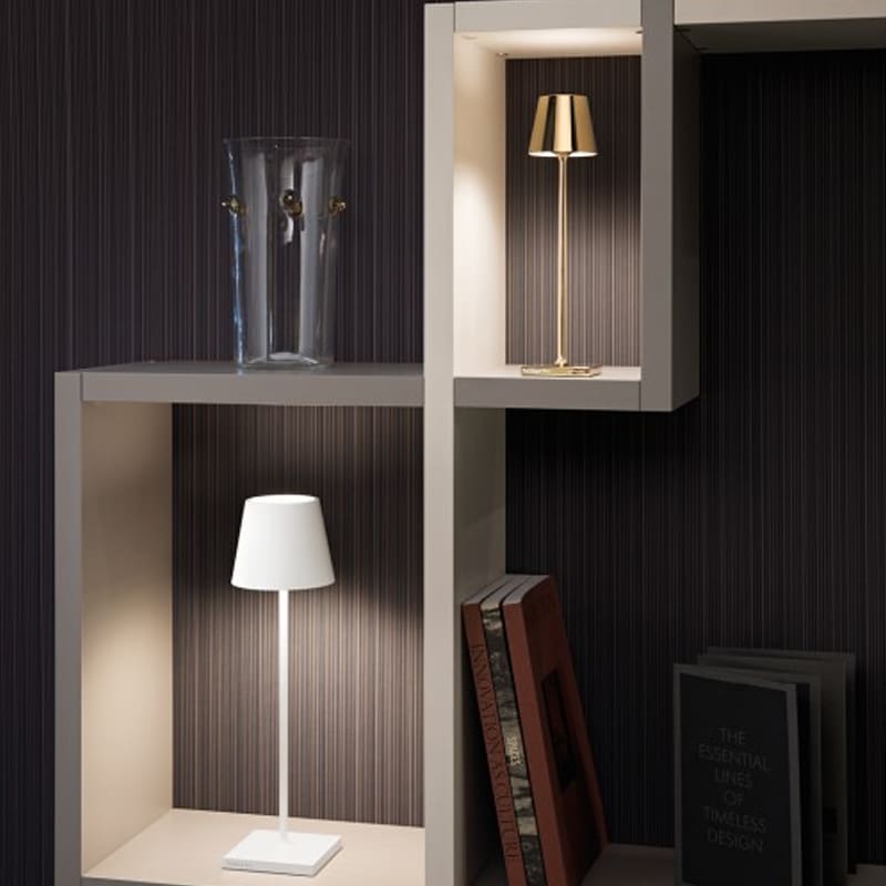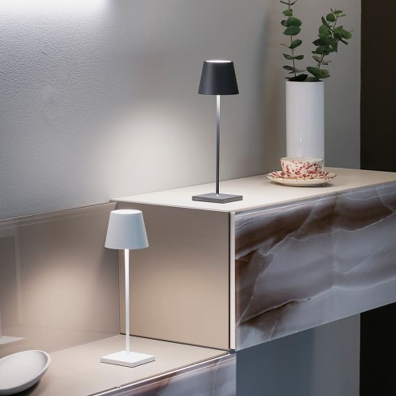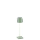 Zafferano – Lampada da tavolo Poldina salvia; Lampada ricaricabile da tavolo, compresa di base di ricarica a contatto, con corpo in alluminio verniciato, diffusore in policarbonato e fonte luminosa a LED.
