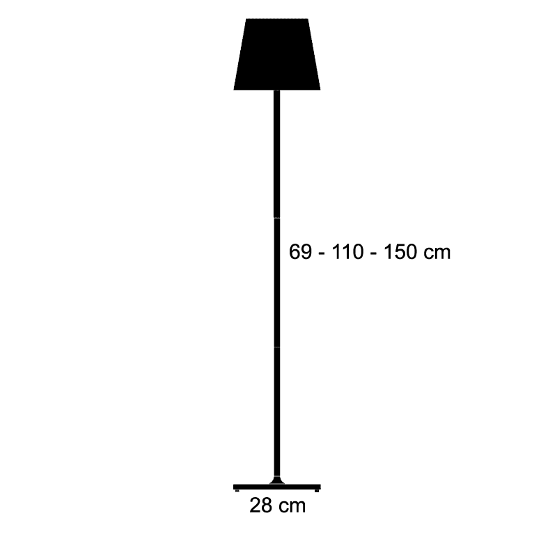 della temperatura di colore della luce tra 2700 K e 3000 K. Grazie a un alto indice di protezione, la lampada è utilizzabile anche all’esterno. È dotata di base di ricarica a contatto. Caricabatterie incluso. È fornita con un kit di 3 aste che permette di configurarne l’altezza in tre misure: 69, 110 o 150 cm.
